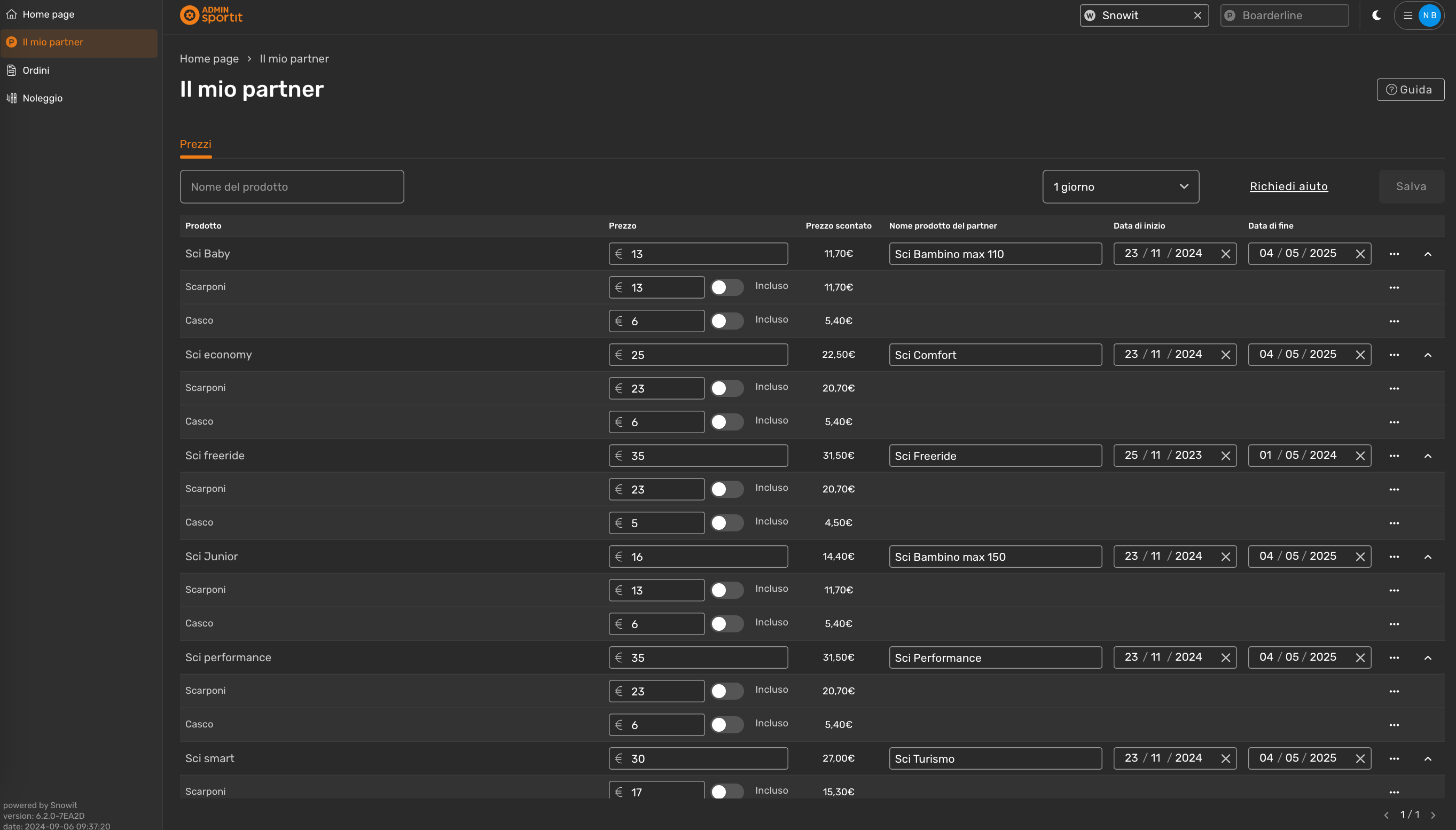 - i prezzi delle opzioni casco e scarponi per ciascun prodotto (spuntando "incluso", potranno essere aggiunti gratis dal cliente al relativo prodotto).